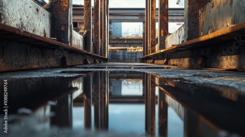 Industrial Urban Landscape with Reflection in Puddles, Capturing Rusty Metal Beams, Rusty Structures, and Natural Light in an Industrial Setting
