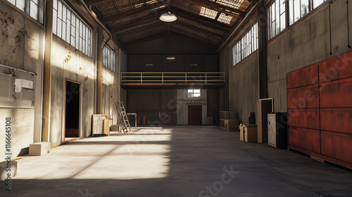Industrial Warehouse Interior with Organized Shelves, Stacked Pallets, and Spacious Logistics Workspace