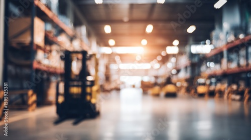 Industrial warehouse scene with forklift loader, logistics theme and blurred background.