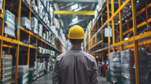 Industrial Warehouse Worker in Safety Helmet Observing Storage Shelves Filled with Goods and Equipment in a Modern Logistics Facility