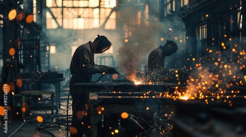 industrial welders at work showers of sparks illuminating dim factory interior focused craftsmen molten metal glow dynamic composition