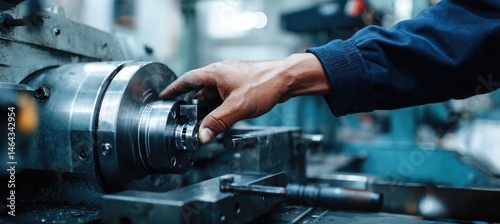 Industrial work a worker using a metal lathe machine in a factory workshop to make parts for products or equipment. This heavy industry concept has a copy space banner background