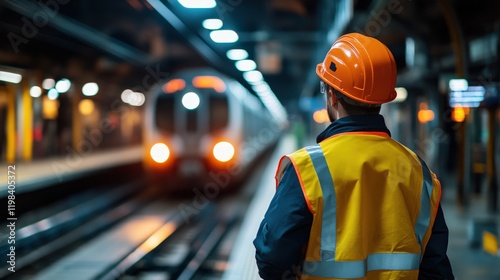 Industrial worker at a railway station wearing high-visibility gear as a train approaches