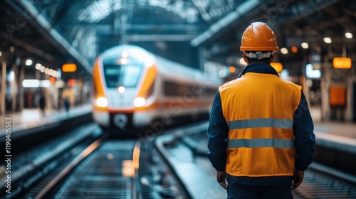 Industrial worker at a railway station wearing high-visibility gear as a train approaches