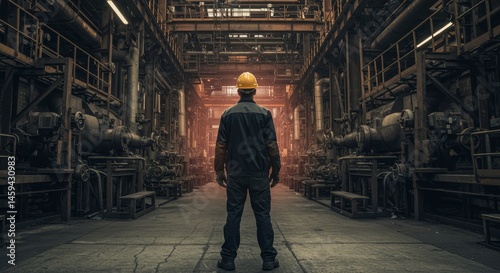 Industrial Worker Contemplating Future - A lone worker in a hard hat stands in a vast industrial factory, symbolizing industry, labor, progress, contemplation, and the future of manufacturing