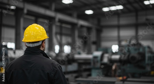 Industrial worker in manufacturing facility with safety helmet and engineering machinery
