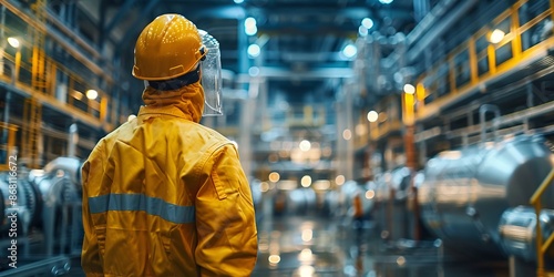 Industrial Worker in Safety Gear Inside Modern Factory with Bright Lights