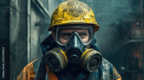 Industrial worker in safety gear with gas mask and hard hat displaying determination in a gritty workplace setting with industrial backdrop