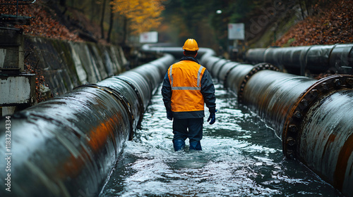 Industrial Worker Inspecting Large Pipes in Stream