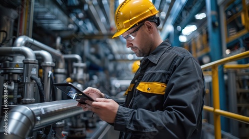 Industrial worker inspecting machinery with a tablet, illustrating the integration of technology in industry
