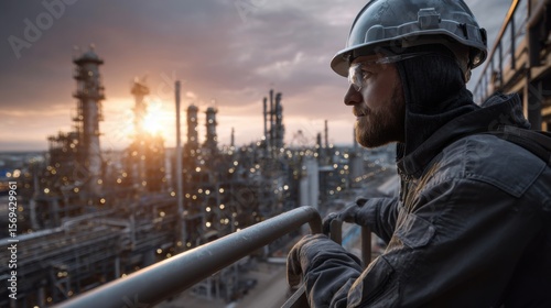 Industrial worker overlooking oil refinery at sunset urban environment photograph industrial concept