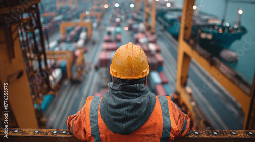 Industrial worker overseeing a container port operation. Hard hat and high-visibility vest protect worker as they survey the cargo ship docked at the busy port.