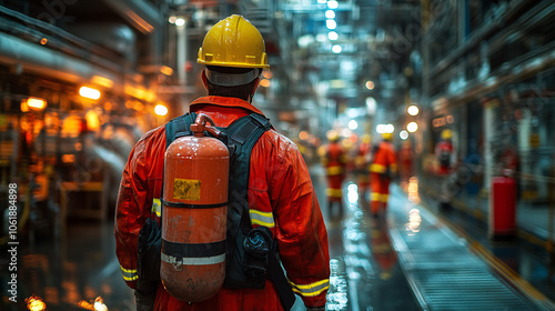 Industrial Worker Wearing Protective Gear and Carrying a Fire Extinguisher