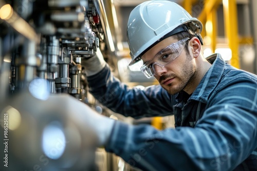 Industrial Worker Wearing Safety Gear Inspecting Machine