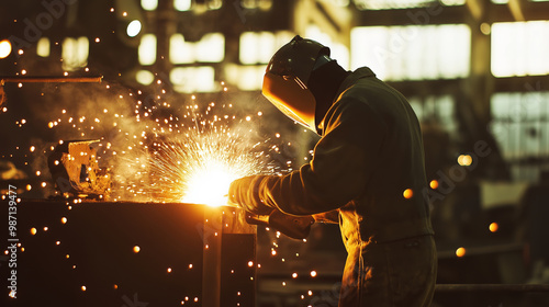 Industrial worker welding metal with protective gear, bright sparks flying, workshop setting, industrial safety concept