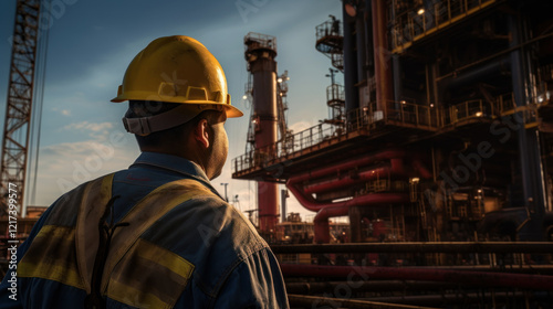 Industrial Worker with Hard Hat Observing Machinery at Sunset in Oil Refinery Environment, Highlighting Safety and Operational Efficiency in Engineering
