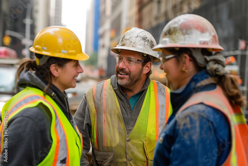 Industrial Workers and Builders in Helmets Discussing After a Day of Renovations in the City