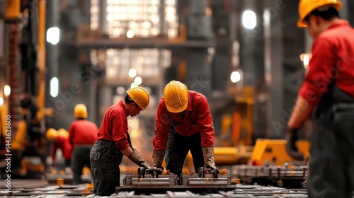 Industrial Workers in Safety Gear Collaborate on Manufacturing Line Precision Assembly Heavy Industry Factory Setting Teamwork Metal Fabrication