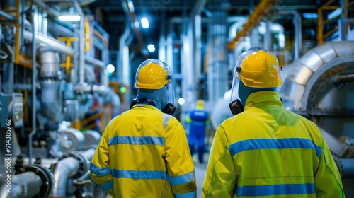 Industrial workers in safety gear inspecting machinery at a factory, ensuring operational safety and efficiency.