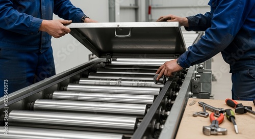 Industrial Workers Inspecting Metal Roller Conveyor System