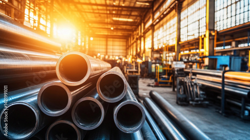 Industrial workshop displays bright metal pipes in sunlight Generative AI