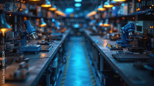 Industrial workspace with microscopes and tools for electronics repair.