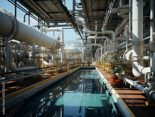 Industrial zone Interior of factory building Steel pipelines and cables in blue tones