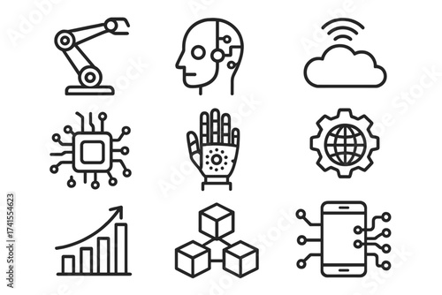 Industry 4.0 vector icon set. Digital revolution, future technology signs. Robotics, AI, big data, blockchain, cloud computing, automation, and smart factory line symbols.