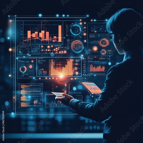 Industry 5.0 holographic screens. Digital contents., Ai, Smart industry factory, industrial revolution, Engineer use Ai interface record and control robotic automatic with monitoring Ai system.