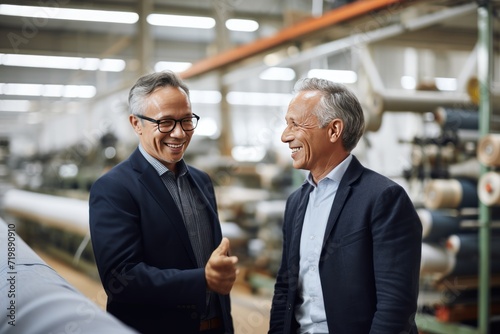 Industry concept, Senior businessman smiling while looking at colleague in factory.