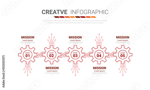 Industry infographic, Gear style. Pie chart, cycle chart, round chart templates with 5 options, parts, steps, processes.
