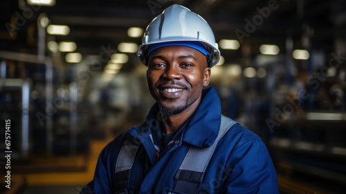 Industry portrait of african engineer holding tablet, background blue power plant control room