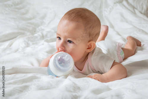 Infant baby girl lying on the white bed with special bottle of water with nipple. Tries to gnaw her. Aching teeth.