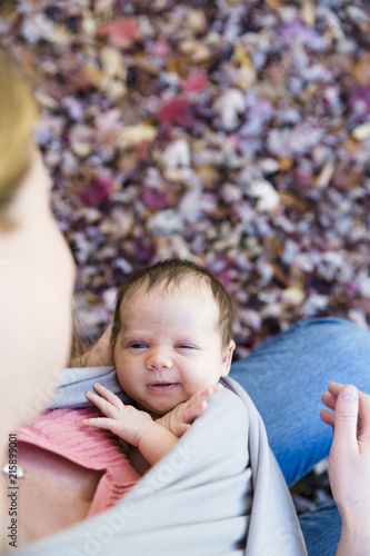 Infant wakes up and looks at mother