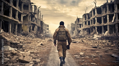 Infantryman during a special operation in bombed city. Cleansing of a captured city.