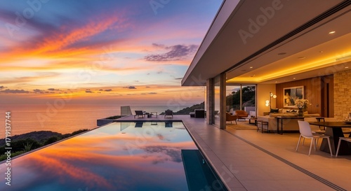 Infinity Pool Reflecting Vibrant Sunset at Modern Villa Overlooking Ocean
