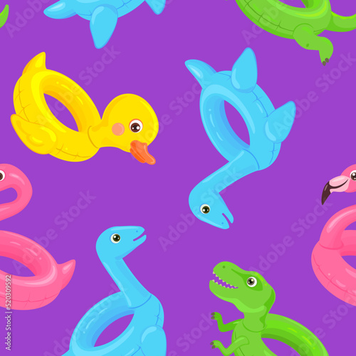 Inflatable floats seamless pattern. Vector cartoon flat summer icons on purple background. Swimming pool toy. Cute illustration of plesiosaur, t-rex, flamingo and duck.