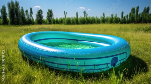 Inflatable Pool - Fun Under the Sun. Outdoor Blue Plastic Pool Inflated with Water Surrounded by Green Grass and Colors of Summer Outdoors