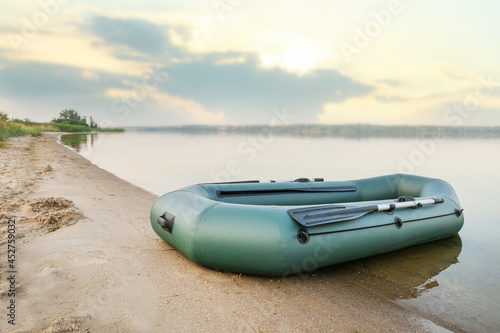 Inflatable rubber fishing boat on sandy beach near river