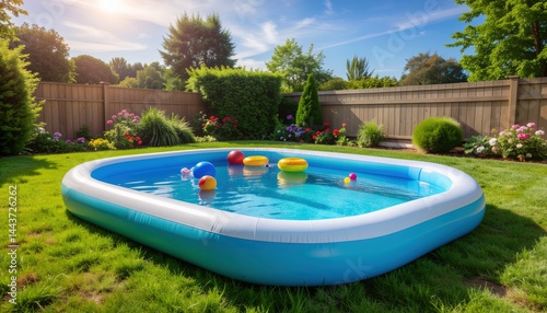 Inflatable swimming pool enjoying summer sun in backyard garden