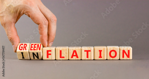 Inflation or greenflation symbol. Concept words Inflation or Greenflation on wooden cubes. Beautiful grey background. Businessman hand. Ecological business inflation greenflation concept. Copy space.