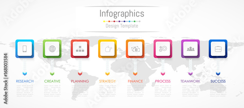 Infographic design elements for your business data with 8 options, parts, steps, timelines or processes. Vector Illustration. World map of this image furnished by NASA
