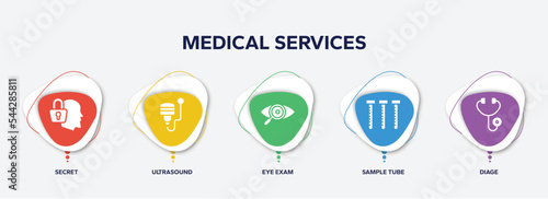 infographic element template with medical services filled icons such as secret, ultrasound, eye exam, sample tube, diage vector.