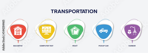 infographic element template with transportation filled icons such as bus depot, computer test, right, pickup car, harbor vector.