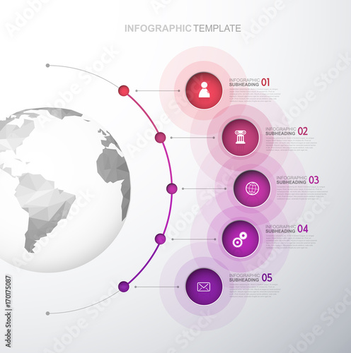 Infographic template with five circles and icons line up beside polygonal map - light version.