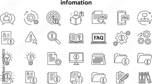 Information icons set, business documents, FAQ symbols, data files, search knowledge, outline style, vector illustration pack