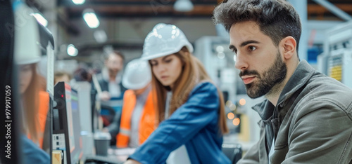 Ingenieros industriales en proyectos, a través del ordenador. Un grupo de ingenieros, reunido y debatiendo con su mirada atenta a un monitor.