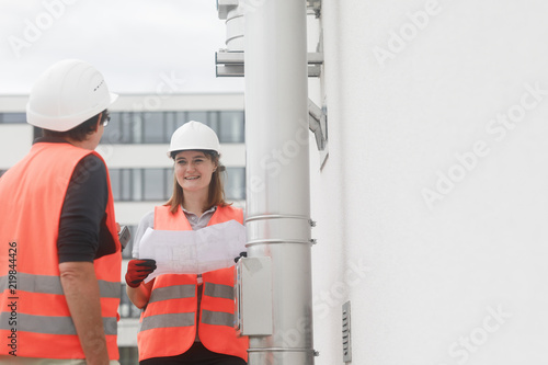 Ingenieur Junge Frau und ältere Frau mit Helm untersuchen Rohr