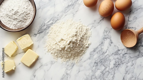 Ingredients for a baking recipe, including flour, sugar, eggs, and butter, arranged neatly on a marble countertop -