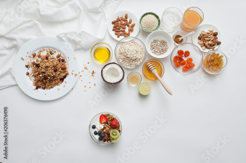 Ingredients for a healthy breakfast - granola, honey, nuts, berries, fruits, top view.